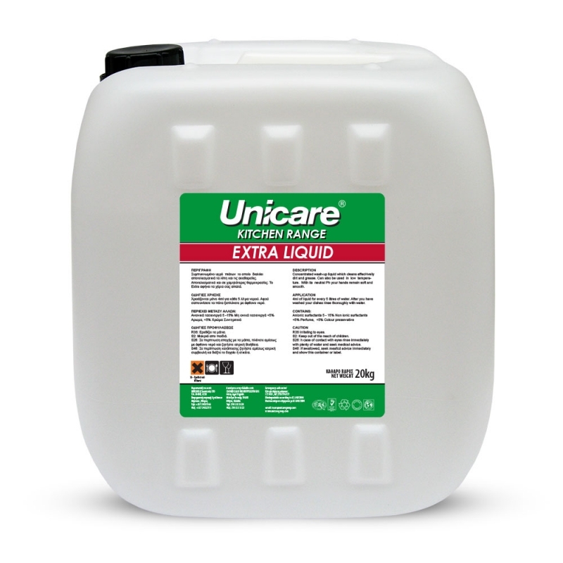Το συμπυκνωμένο υγρό πιάτων το οποίο διαλύει αποτελεσματικά τα λίπη και τις ακαθαρσίες. Αποτελεσματικό και σε χαμηλότερες θερμοκρασίες. Το Extra αφήνει τα χέρια σας απαλά.