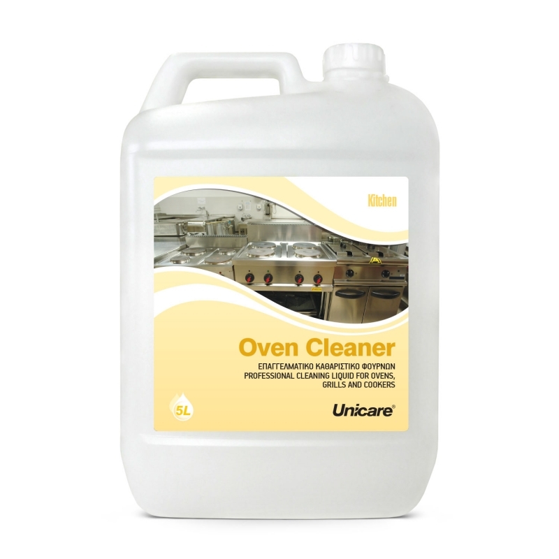 To Unicare Oven Cleaner καθαρίζει τα κατάλοιπα καμένου λίπους και λαδιών από φούρνους, σχάρες και επαγγελματικές εστίες κουζίνας. Αποτελείται από τασιενεργά αλκαλικά συστατικά και διαλύτες.