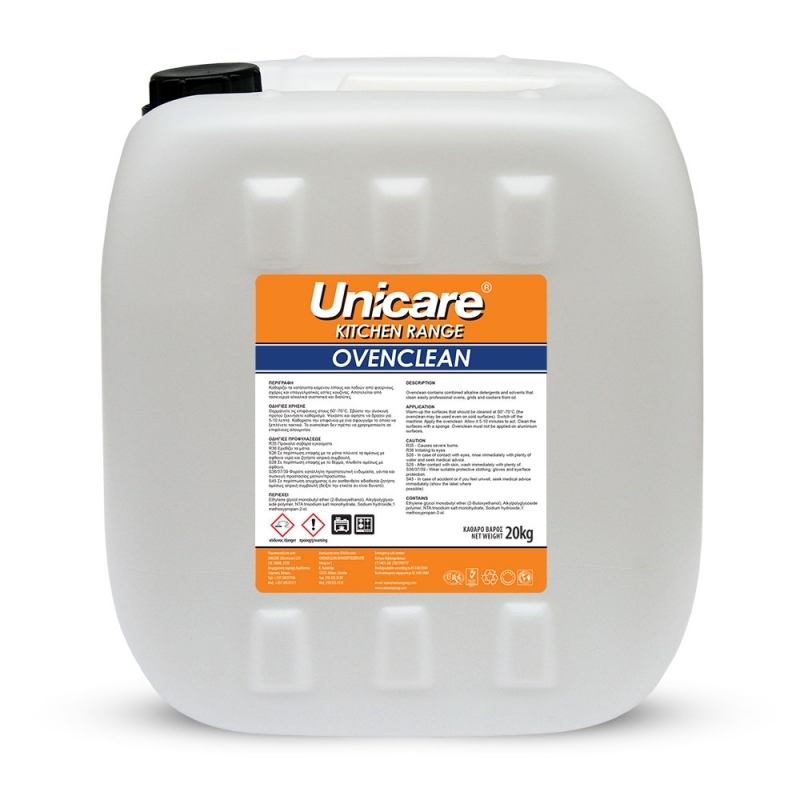 To Unicare Ovenclean Καθαρίζει τα κατάλοιπα καμένου λίπους και λαδιών από φούρνους, σχάρες και επαγγελματικές εστίες κουζίνας. Αποτελείται από τασιενεργά αλκαλικά συστατικά και διαλύτες.